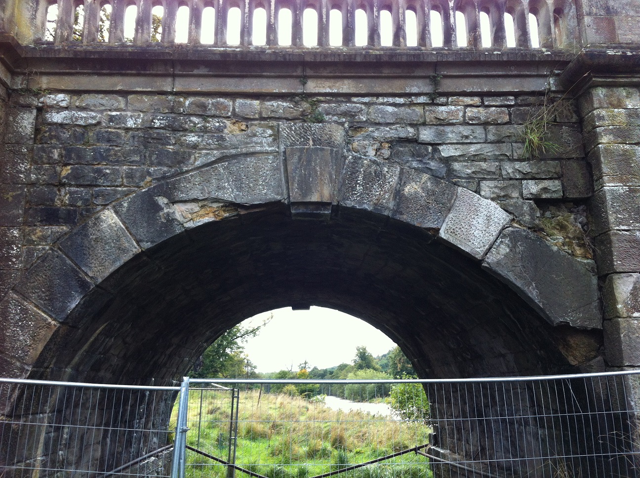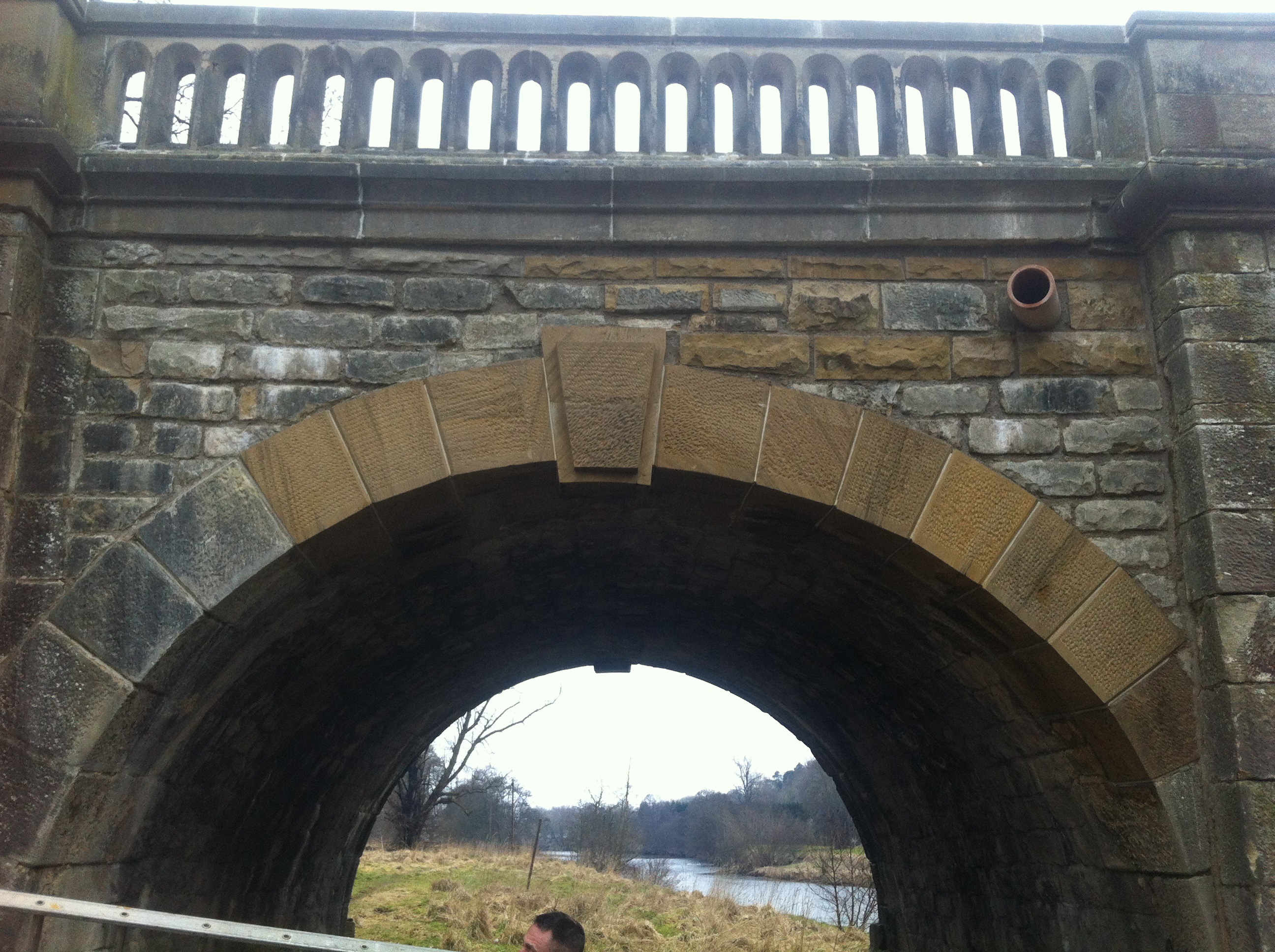 Erect temporary formwork, excavate arch infill, take down string course and spandrel wall. Take out existing stones, reform arch using new stonework. Reconstruct spandrel wall, string course, parapet and install new coping stones.